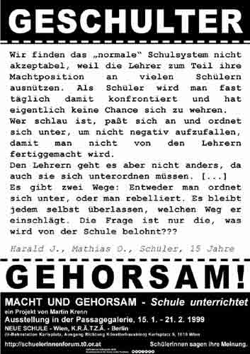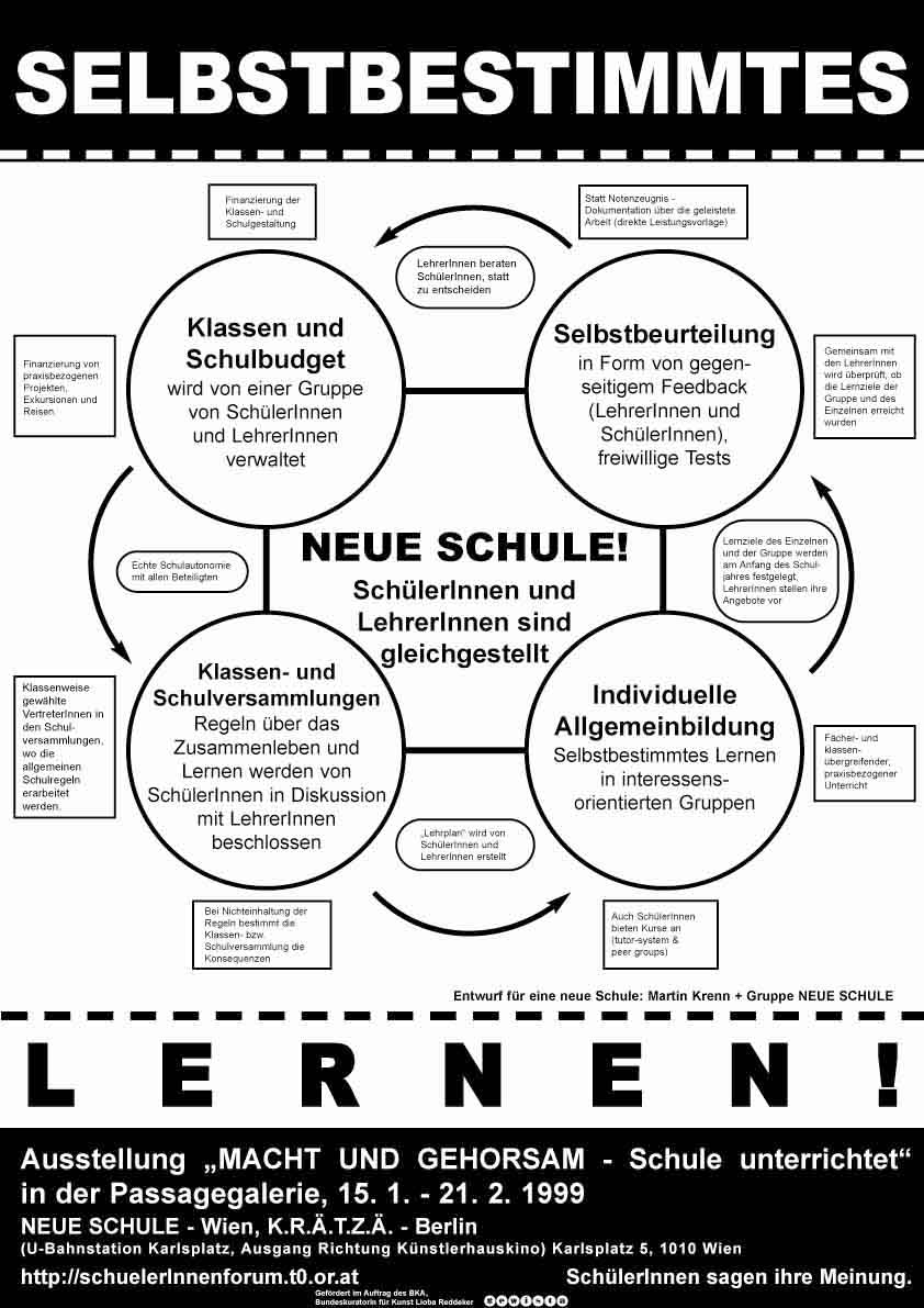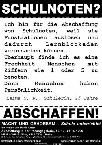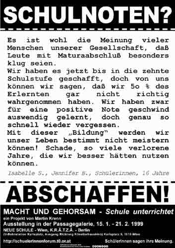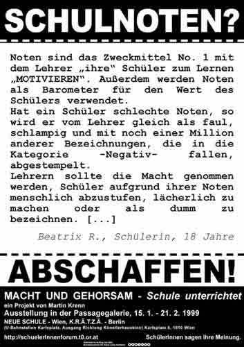 über das System." Plakatserie Öffentlich heißt, daß seit kurzem eine mit kritischen Schülern erarbeitete Plakatserie an stark frequentierten Verkehrsknotenpunkten auf die Problematik aufmerksam macht. Dazu wird am kommenden Donnerstag in der Passagegalerie des Künstlerhauses um 20 Uhr eine Ausstellung eröffnet, die den Verlauf des Unternehmens dokumentieren soll. Gestartet hat Martin Krenn sein von Lioba Reddeker, der Bundeskuratorin für Kunst, unterstütztes Projekt genau vor einem Jahr. Damals machte er sich in Wien auf die Suche nach engagierten LehrerInnen und stellte in ihren Klassen sein Konzept vor. Er moderierte Diskussionen und lud die SchülerInnen ein, Statements "gegen Notenbeurteilung, Schulgehorsam und für Selbstbestimmung" abzugeben. Die Statements wurden auf eine Homepage im Internet übertragen (schuelerInnenforum.t0.or.at), die per E-mail in anderen Schulen bekanntgemacht wurde, so daß weitere Statements - auch aus Deutschland - eingingen. Zuletzt ergab sich noch eine Kooperation mit der Berliner Gruppe K.R.Ä.T.Z.Ä. (Kinder-Rächts-Zänker), die sich ebenfalls im Künstlerhaus präsentieren wird. Gruppe "Neue Schule" Eine Reihe von Schülern fand an dem Projekt so großen Gefallen, daß sie sich sogar in ihrer Freizeit mit Krenn traf und die Gruppe "Neue Schule" bildete. Sie wählten die Plakate aus und entwickelten in langen - auf Video dokumentierten - Diskussionen ein eigenes Modell für eine Schule, in der Schüler und Lehrer gleichgestellt sind. Krenn selbst hat bereits