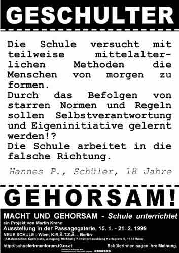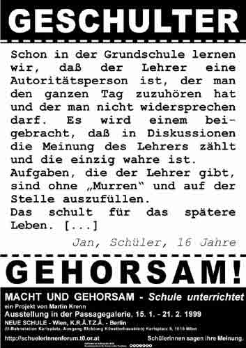 kann es ihnen nachfühlen und macht ihren Widerstand öffentlich. Wien - "Wie kommt es", fragt der Wiener Projektkünstler Martin Krenn, "daß so viele Menschen die Macht-und Herrschaftsverhältnisse, denen sie selbst unterworfen sind, einfach akzeptieren?" Seine Antwort: "Weil das Sich-Einfügen von klein auf systematisch trainiert wird." Unter anderem in der Schule. Dort wird erwartet, daß Anweisungen von Direktion, Klassenvorstand und LehrerInnen möglichst kritiklos befolgt werden. Die Mechanismen der Disziplinierung lassen sich am besten an den Hausordnungen ablesen, die oft schon allein durch die Wortwahl Bände sprechen. So heißt es in einem Wiener Internat noch heute stramm militärisch: "Das rechtzeitige Einrücken hat bis 21 Uhr zu erfolgen." Und obwohl SchülervertreterInnen