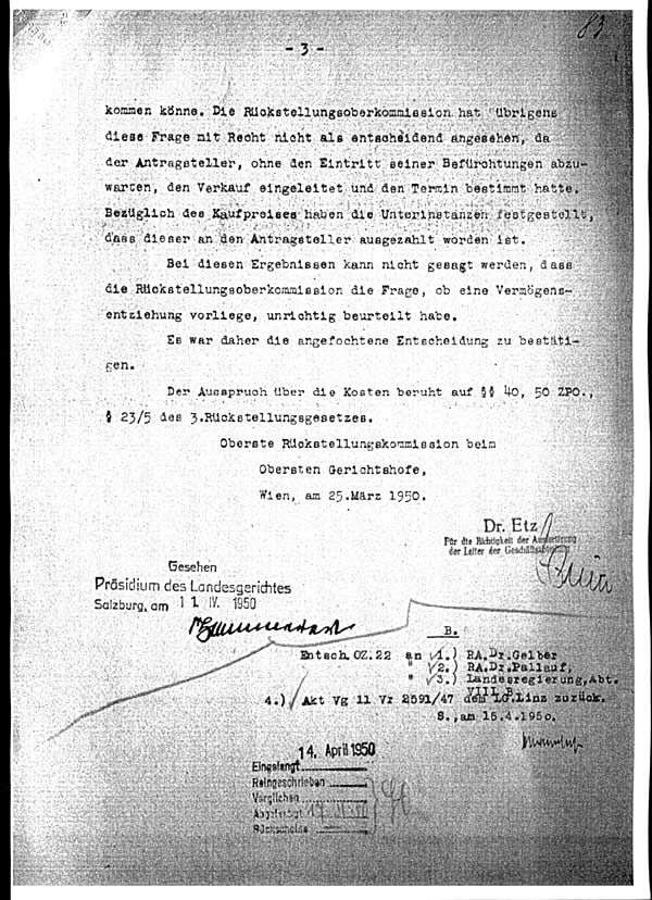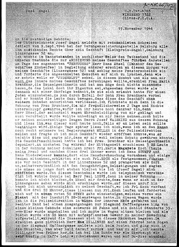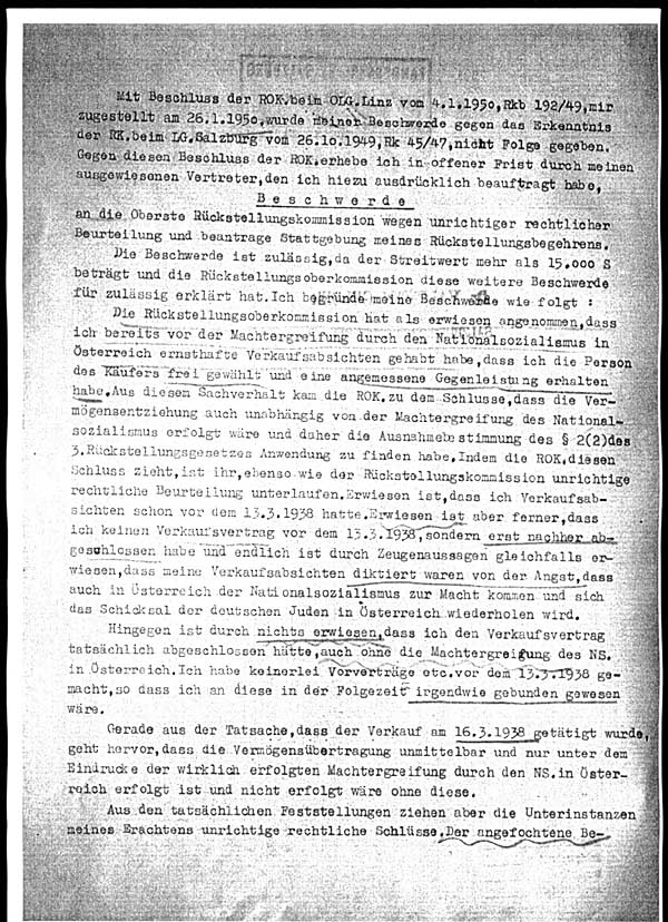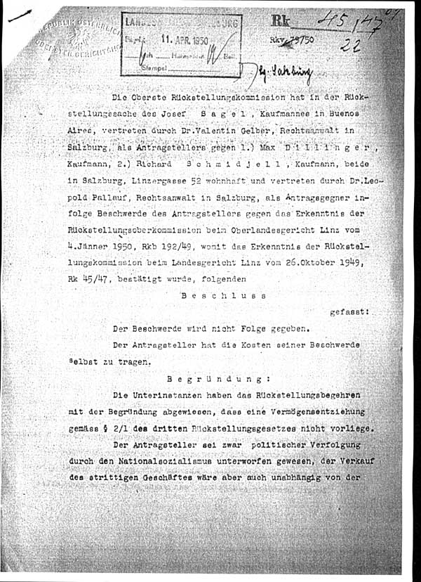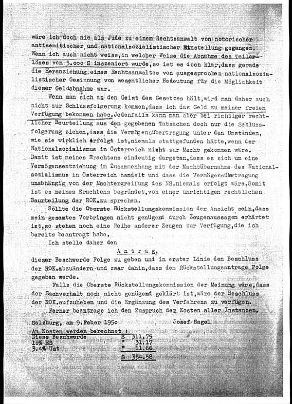Josef Sagels gegen den Beschluß der Rückstellungskommission